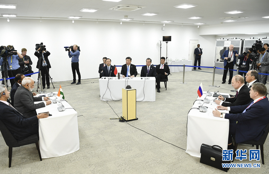 6月28日,國家主席習(xí)近平在大阪出席中俄印領(lǐng)導(dǎo)人會晤,同俄羅斯總統(tǒng)普京、印度總理莫迪就當(dāng)前國際形勢、重大國際和地區(qū)問題、三方合作深入交換意見。新華社記者 謝環(huán)馳 攝