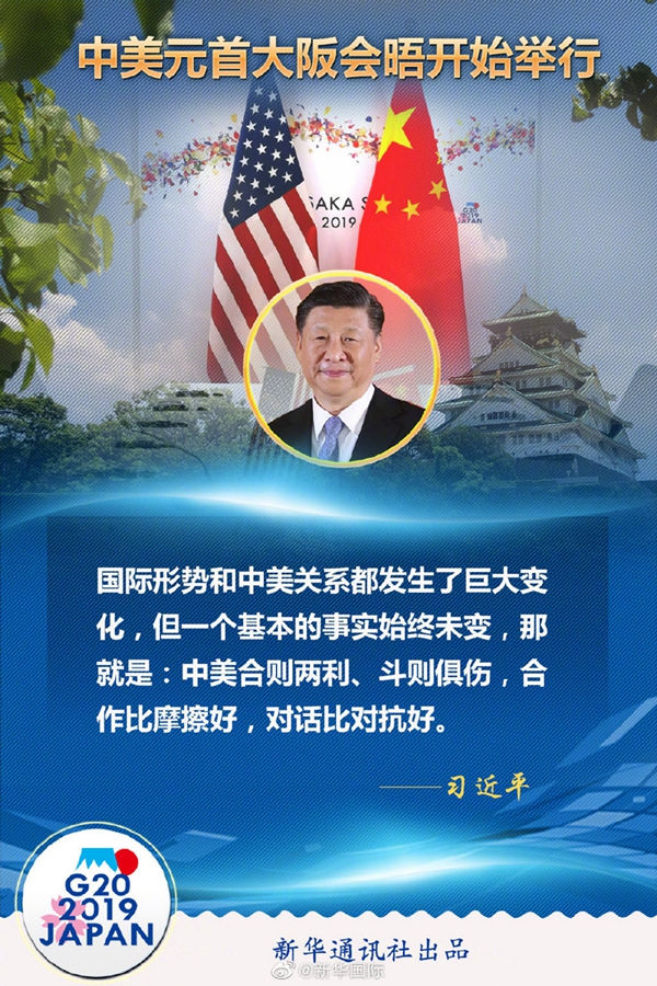 習(xí)近平在會(huì)晤開始時(shí)說,很高興同總統(tǒng)先生在大阪見面。48年前,也就是1971年,就在離這里100多公里的名古屋,參加第三十一屆世界乒乓球錦標(biāo)賽的中美乒乓球運(yùn)動(dòng)員進(jìn)行了友好互動(dòng),這就是后來人們說的“乒乓外交”的開啟,創(chuàng)造了“小球轉(zhuǎn)動(dòng)大球”的歷史佳話。8年之后的1979年,中美建立了外交關(guān)系。回顧建交以來的40年,國際形勢(shì)和中美關(guān)系都發(fā)生了巨大變化,但一個(gè)基本的事實(shí)始終未變,那就是:中美合則兩利、斗則俱傷,合作比摩擦好,對(duì)話比對(duì)抗好。近來,我同總統(tǒng)先生通過電話和書信保持著密切聯(lián)系。今天,我愿同總統(tǒng)先生就事關(guān)中美關(guān)系發(fā)展的根本性問題交換意見,為下階段兩國關(guān)系發(fā)展定向把舵,推進(jìn)以協(xié)調(diào)、合作、穩(wěn)定為基調(diào)的中美關(guān)系。