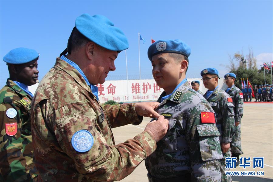 4月3日,在位于黎巴嫩南部辛尼亞村的中國(guó)維和部隊(duì)營(yíng)區(qū)舉行的授勛儀式上,聯(lián)黎部隊(duì)司令德爾科爾(前左)為官兵代表佩戴勛章。新華社發(fā)