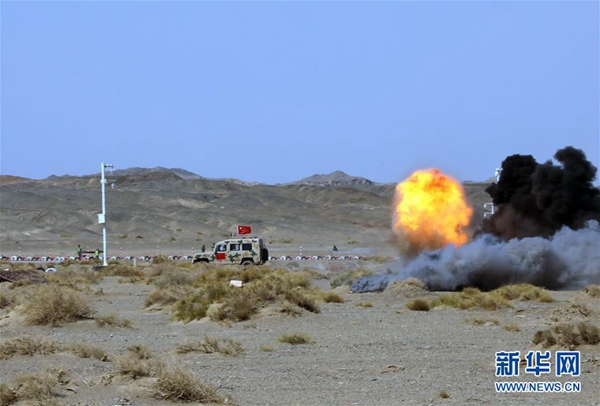 在“國(guó)際軍事比賽-2019”“安全環(huán)境”項(xiàng)目單組賽中,中國(guó)參賽隊(duì)快速通過(guò)雷爆區(qū)(8月8日攝)。新華社發(fā)(王軍強(qiáng) 攝)