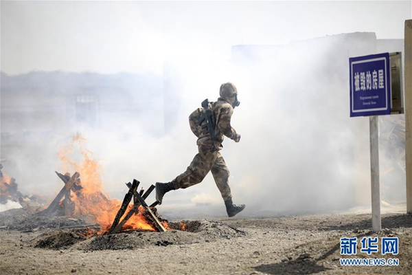在“國(guó)際軍事比賽-2019”“安全環(huán)境”項(xiàng)目單組賽中,中國(guó)參賽隊(duì)員通過(guò)火障(8月8日攝)。新華社發(fā)(王鵬飛 攝)
