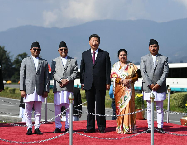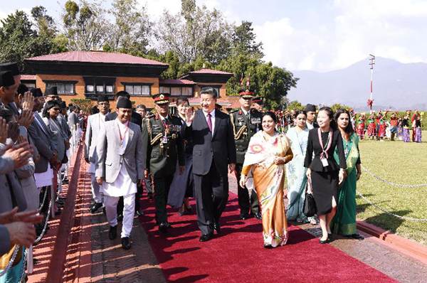10月12日,國家主席習(xí)近平乘專機(jī)抵達(dá)加德滿都,開始對尼泊爾進(jìn)行國事訪問。尼泊爾總統(tǒng)班達(dá)里在機(jī)場為習(xí)近平舉行具有濃郁尼泊爾民族特色的歡迎儀式。新華社記者高潔攝