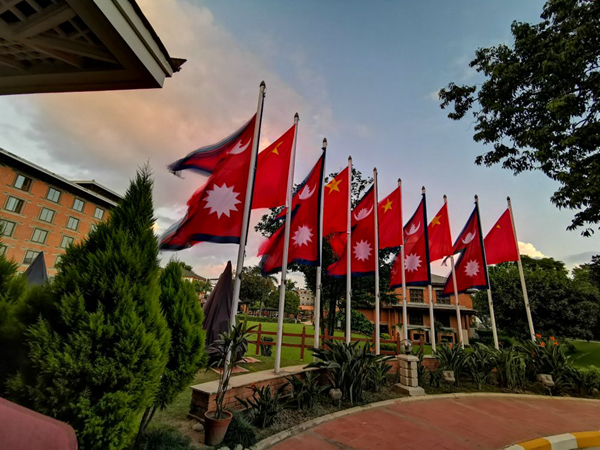 習(xí)近平主席在加德滿都下榻的飯店院內(nèi)飄揚(yáng)著中尼兩國國旗。新華社記者賴向東攝