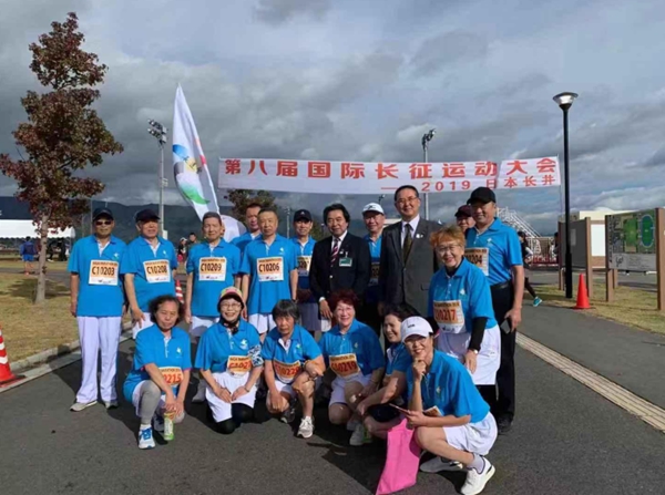 日本長井市市長內谷重治、副市長平進介、國際長征運動會創(chuàng)始人杜地以及部分運動員在比賽現(xiàn)場合影。(圖片由國際長征運動會委員會提供)
