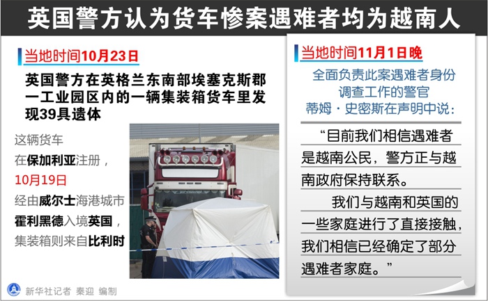 全面負(fù)責(zé)此案遇難者身份調(diào)查工作的警官蒂姆·史密斯在聲明中說(shuō):“目前我們相信遇難者是越南公民,警方正與越南政府保持聯(lián)系。我們與越南和英國(guó)的一些家庭進(jìn)行了直接接觸,我們相信已經(jīng)確定了部分遇難者家庭。”