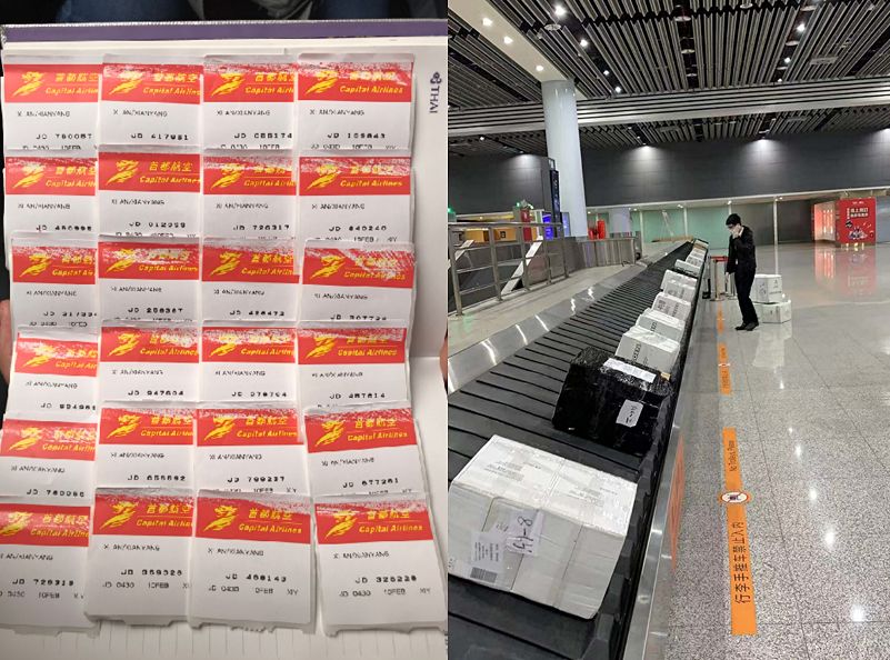 2月5日,首架貨機從西班牙馬德里(CA1026次航班)出發(fā),于當天早上7:40分抵達了河南新鄭國際機場。在這架飛機上,載滿了口罩、護目鏡、防護服、消毒液等疫情急需物資,總計18個托盤,約5噸,371336件,總價值人民幣377450元。