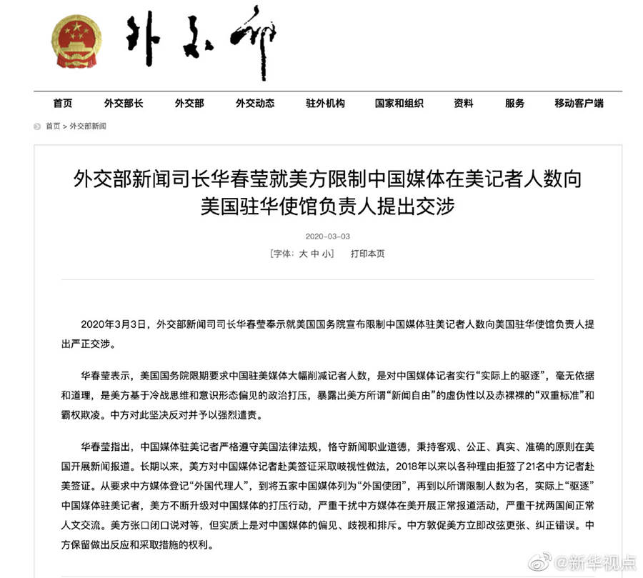 外交部新聞司司長華春瑩3日奉示就美國國務(wù)院宣布限制中國媒體駐美記者人數(shù)向美國駐華使館負責人提出嚴正交涉。華春瑩表示,美國國務(wù)院限期要求中國駐美媒體大幅削減記者人數(shù),是對中國媒體記者實行“實際上的驅(qū)逐”,毫無依據(jù)和道理,是美方基于冷戰(zhàn)思維和意識形態(tài)偏見的政治打壓,暴露出美方所謂“新聞自由”的虛偽性以及赤裸裸的“雙重標準”和霸權(quán)欺凌。中方對此堅決反對并予以強烈遣責。中方敦促美方立即改弦更張、糾正錯誤。中方保留做出反應(yīng)和采取措施的權(quán)利。(記者朱超)