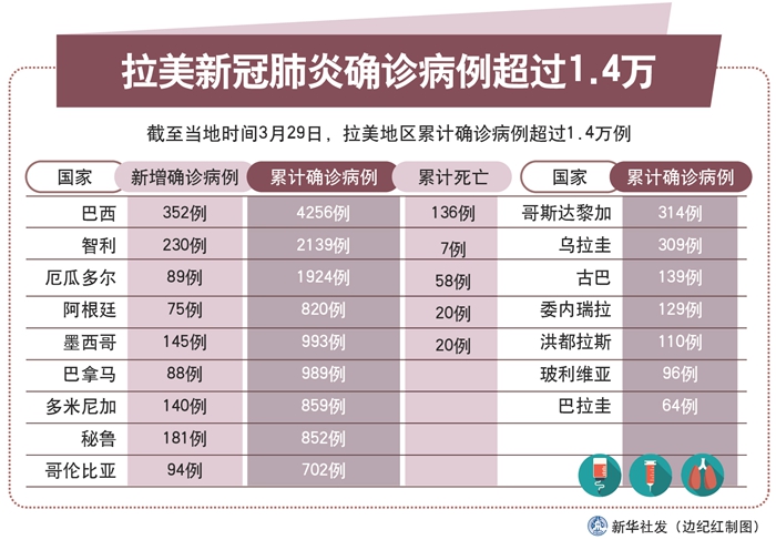 新華社巴西利亞3月29日電 綜合新華社駐拉美地區(qū)記者報道:拉美地區(qū)新冠肺炎疫情持續(xù)加劇。截至29日,拉美地區(qū)累計確診病例超過1.4萬例,其中巴西和智利分別超過4000例和2000例。玻利維亞當(dāng)日報告首例死亡病例。