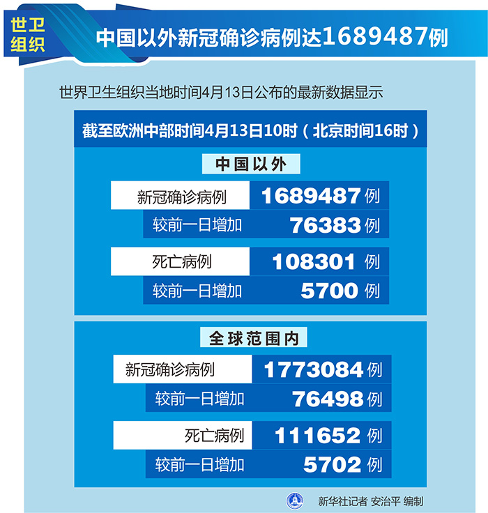 新華社日內瓦4月13日電(記者劉曲)世界衛(wèi)生組織13日公布的最新數(shù)據(jù)顯示,中國以外新冠確診病例達到1689487例。