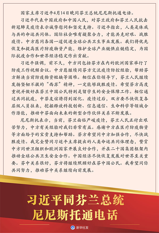 習(xí)近平強(qiáng)調(diào),前不久,中方同包括芬方在內(nèi)的歐洲國家舉行了防疫工作視頻會(huì)議。中方愿繼續(xù)同芬方交流疫情防控經(jīng)驗(yàn),幫助芬方解決當(dāng)前防疫物資短缺等困難。相信在你領(lǐng)導(dǎo)下,芬蘭人民繼續(xù)發(fā)揚(yáng)堅(jiān)韌不拔的“西蘇”精神,一定能夠戰(zhàn)勝疫情。希望芬方高度重視并做好在芬蘭中國公民特別是留學(xué)生的安全保障工作。相信通過共同抗疫,中芬友誼將得到深化。疫情過后,雙方要盡快恢復(fù)各層級(jí)人員往來,挖掘釋放科技創(chuàng)新、信息通信、生命科學(xué)等領(lǐng)域合作潛能,推動(dòng)中芬面向未來的新型合作伙伴關(guān)系不斷發(fā)展。