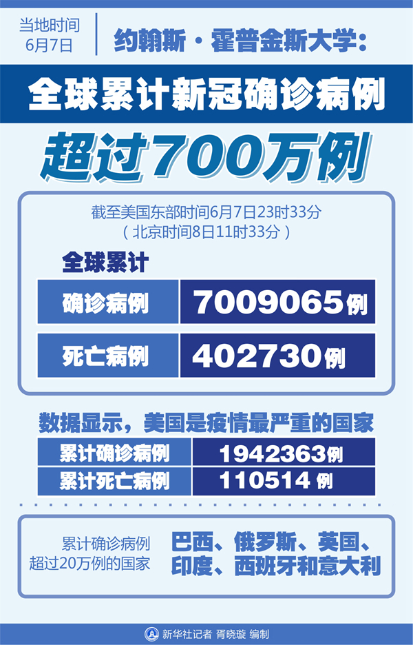 新華社紐約6月7日電 美國約翰斯·霍普金斯大學(xué)7日發(fā)布的新冠疫情統(tǒng)計數(shù)據(jù)顯示,截至美國東部時間7日23時33分(北京時間8日11時33分),全球累計確診病例達(dá)到7009065例,死亡病例為402730例。