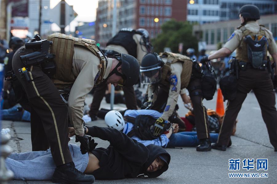 5月31日,在美國明尼蘇達(dá)州明尼阿波利斯市,示威者被警察逮捕。 新華社發(fā)(安格斯·亞歷山大攝)