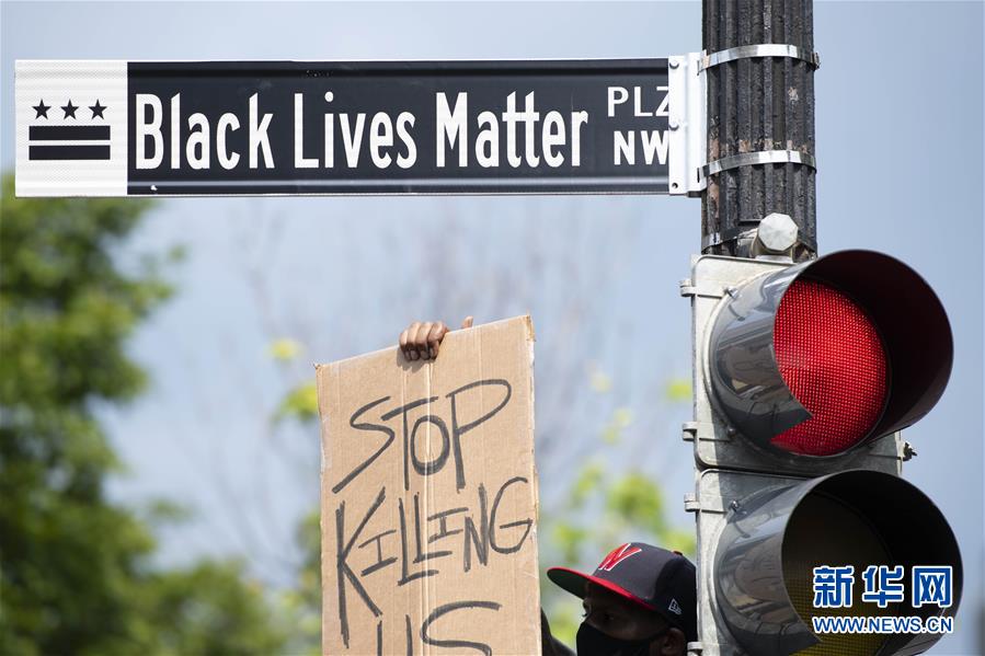 6月6日,一名男子手舉“停止殺害我們”的標(biāo)語在美國華盛頓白宮附近的“黑人的命也是命廣場”路牌下參加游行活動。 新華社記者 劉杰 攝