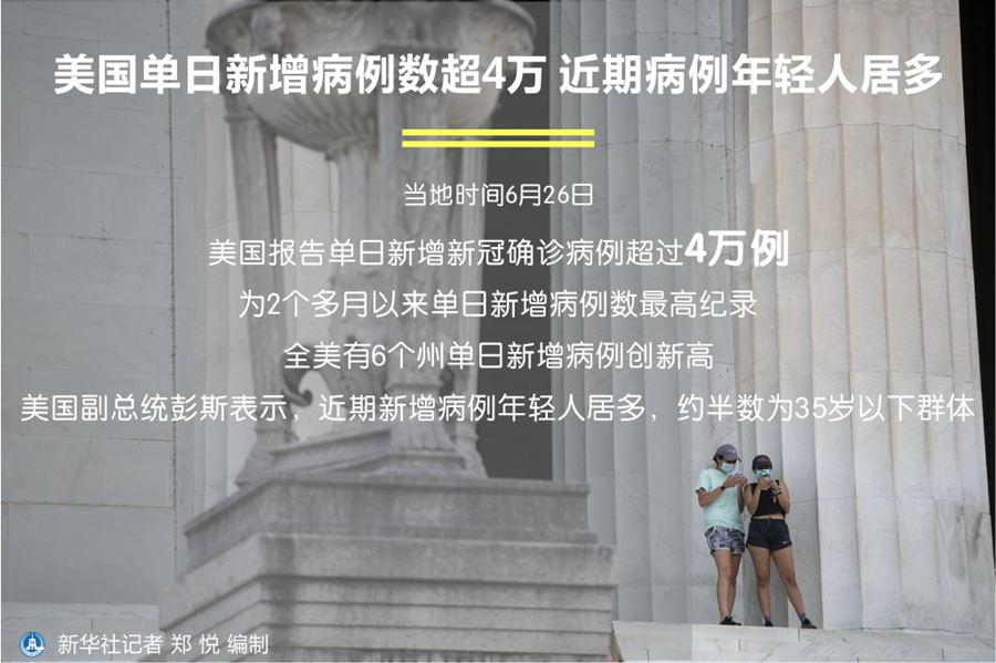 新華社華盛頓6月26日電(記者譚晶晶)美國26日報告單日新增新冠確診病例超過4萬例,為2個多月以來單日新增病例數(shù)最高紀錄。全美有6個州單日新增病例創(chuàng)新高。美國副總統(tǒng)彭斯表示,近期新增病例年輕人居多,約半數(shù)為35歲以下群體。