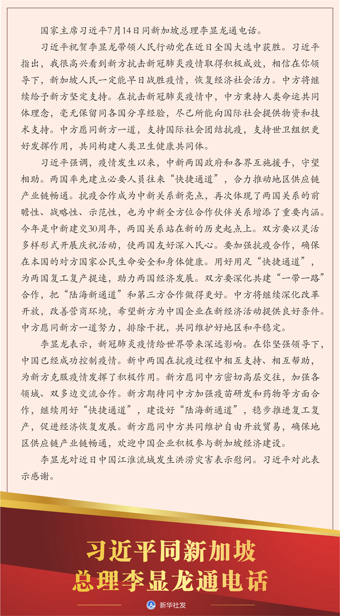 新華社北京7月14日電 國家主席習(xí)近平7月14日同新加坡總理李顯龍通電話。