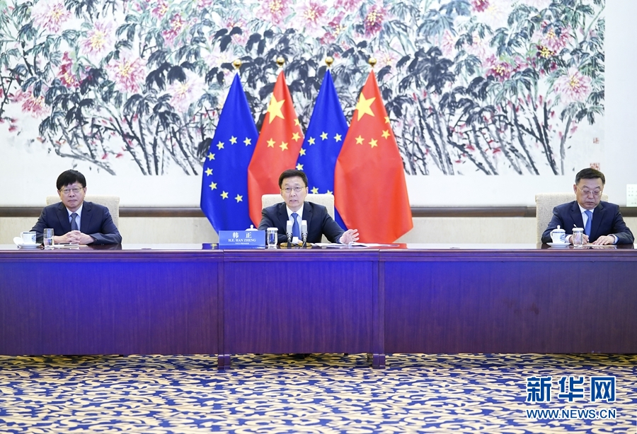 新華社北京7月29日電 中共中央政治局常委、國務(wù)院副總理韓正29日在北京同歐盟委員會第一副主席蒂默曼斯舉行視頻會見。