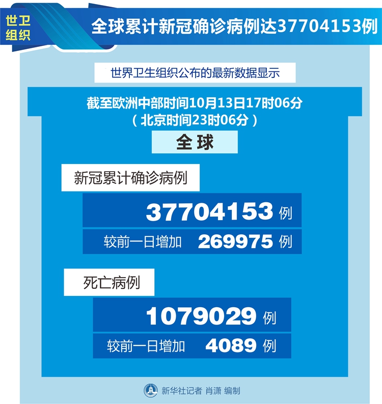 新華社日內瓦10月13日電(記者劉曲)世界衛(wèi)生組織13日公布的最新數(shù)據(jù)顯示,全球累計新冠確診病例達37704153例。