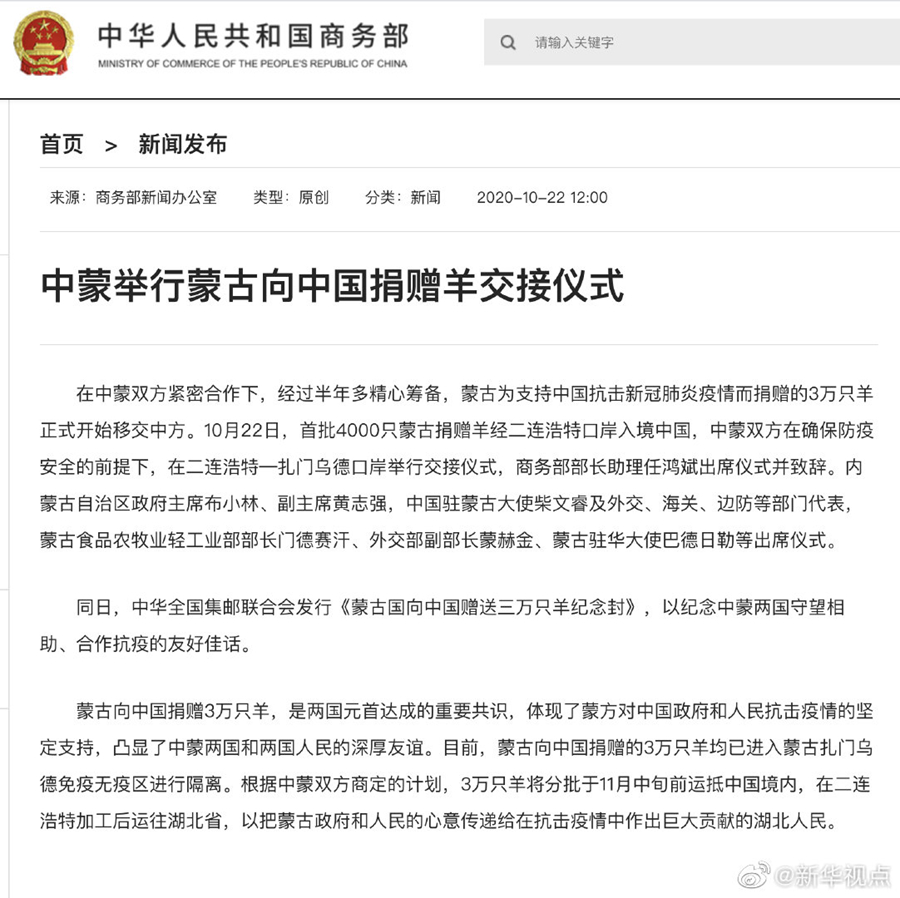 10月22日,首批4000只蒙古國(guó)捐贈(zèng)羊經(jīng)二連浩特口岸入境中國(guó),中蒙雙方在確保防疫安全的前提下,在二連浩特—扎門(mén)烏德口岸舉行交接儀式。詳情?? ????