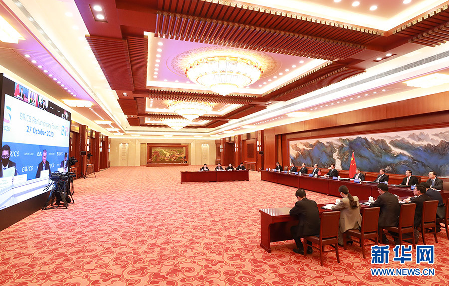10月27日,全國(guó)人大常委會(huì)委員長(zhǎng)栗戰(zhàn)書在北京人民大會(huì)堂出席第六屆金磚國(guó)家議會(huì)論壇視頻會(huì)議并發(fā)表講話。 新華社記者 龐興雷 攝