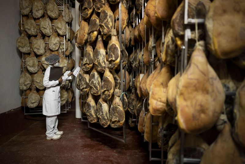 10月28日,在阿根廷首都布宜諾斯艾利斯附近的馬科斯·帕斯,一名工人檢查火腿的制作情況。這座人口僅有6萬多人的小鎮(zhèn)以城市之名報(bào)名參加第三屆進(jìn)博會(huì)。新華社發(fā)(馬丁·薩巴拉攝)