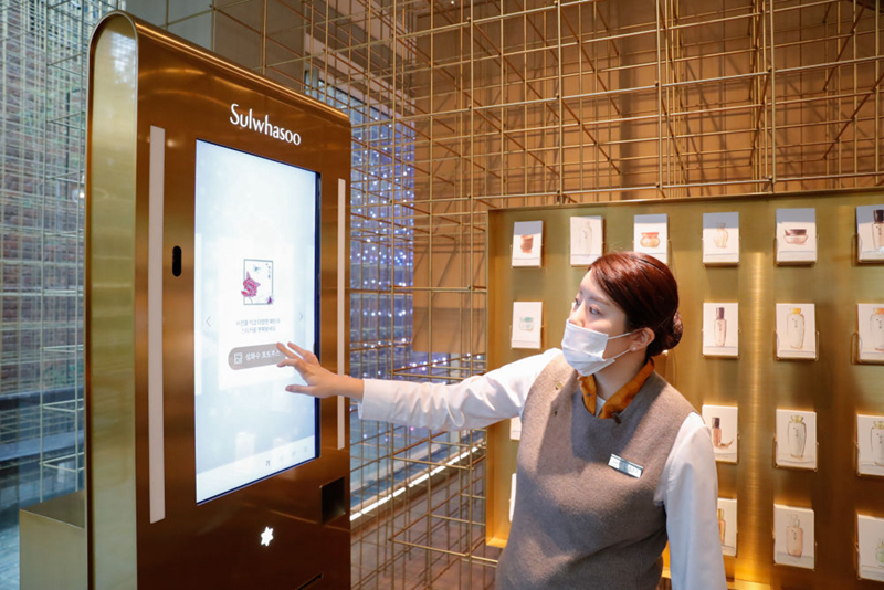 10月27日,工作人員在位于韓國首爾江南區(qū)的愛茉莉太平洋雪花秀旗艦店內(nèi)指導(dǎo)客人體驗(yàn)店內(nèi)設(shè)施??偛课挥陧n國首爾的美妝企業(yè)愛茉莉太平洋集團(tuán)今年將連續(xù)第三次參加進(jìn)博會(huì)。新華社記者 王婧嬙 攝
