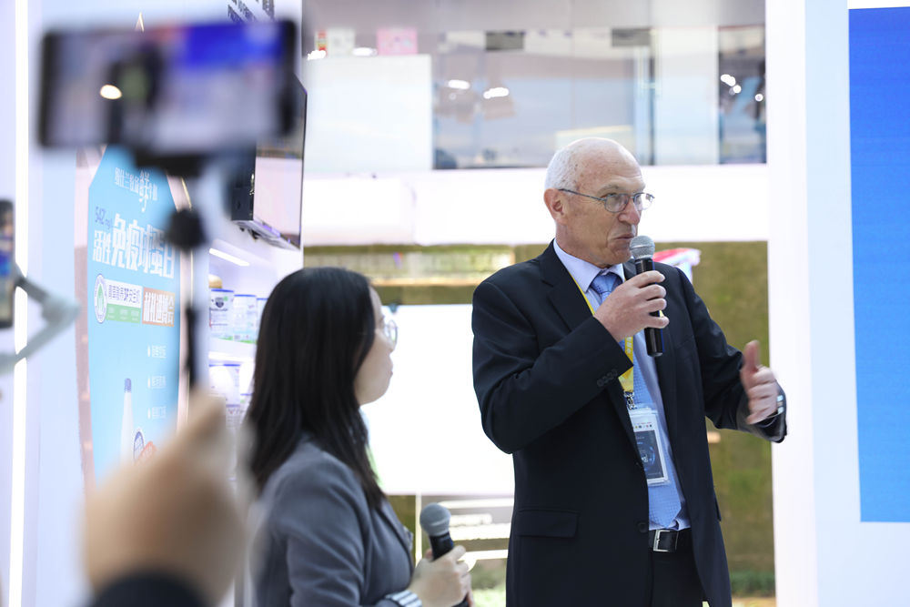 11月7日,羅伊在進博會場館內(nèi)為合作伙伴介紹產(chǎn)品。