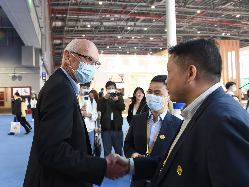 11月5日,羅伊(左)在第三屆進博會現(xiàn)場同合作伙伴交談。