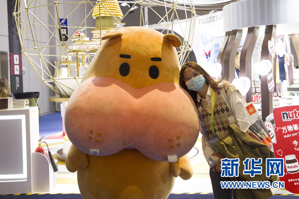 觀眾在第三屆進博會上的食品及農(nóng)產(chǎn)品展區(qū)與人偶合影(11月5日攝)。新華網(wǎng) 吳一航 攝