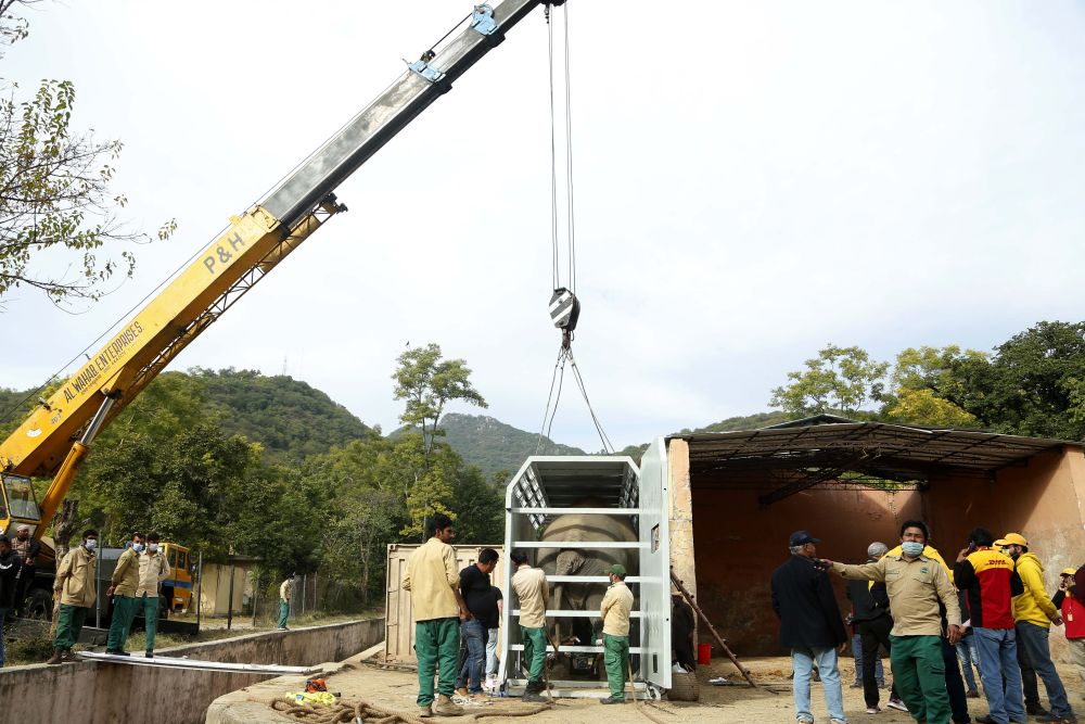 ↑11月29日,在巴基斯坦伊斯蘭堡,工作人員為運(yùn)輸大象做準(zhǔn)備