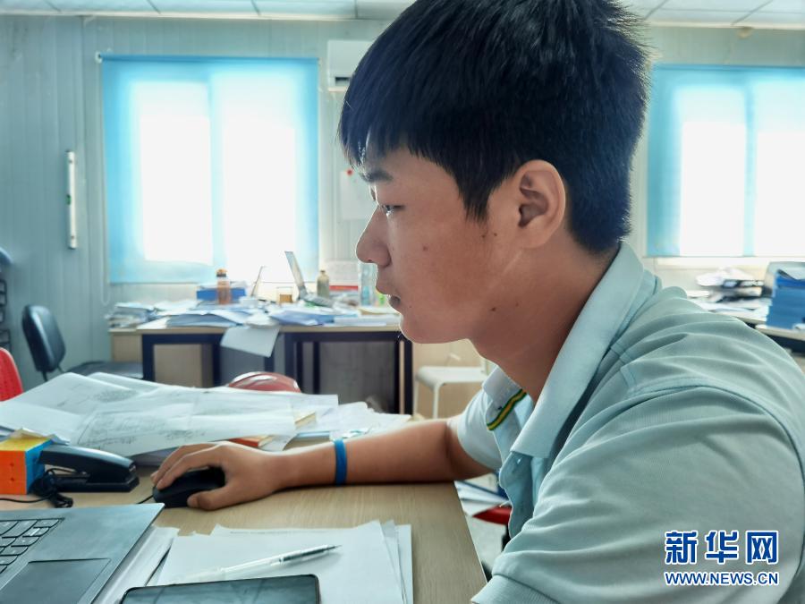 12月14日,在馬爾代夫馬累,臉上有口罩印的安全工程師劉平建在維拉納國際機(jī)場(chǎng)水飛航站樓項(xiàng)目辦公室工作。新華社發(fā)(北京城建集團(tuán)供圖)