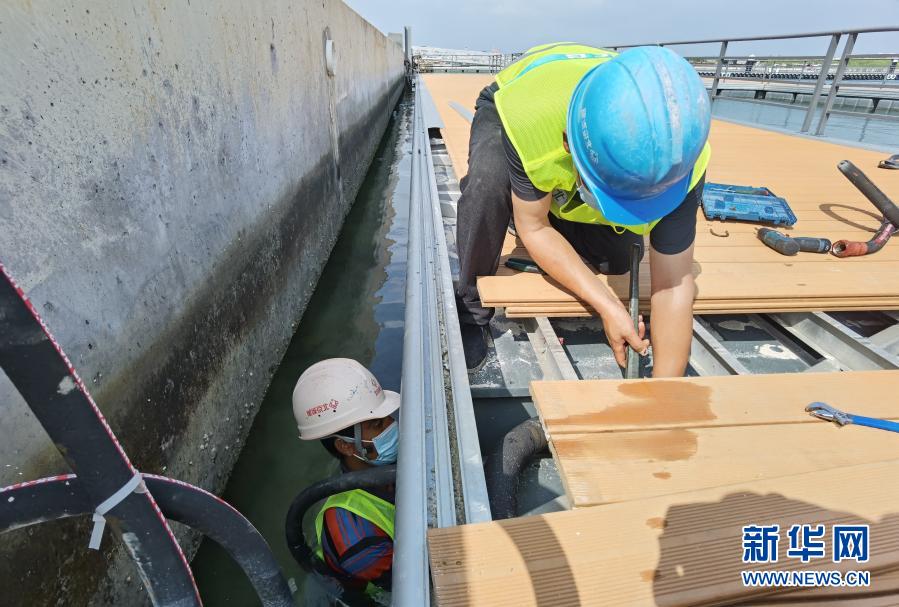 12月16日,在馬爾代夫馬累,機(jī)電施工人員在維拉納國際機(jī)場(chǎng)水飛航站樓水飛浮碼頭進(jìn)行管線調(diào)修。新華社發(fā)(北京城建集團(tuán)供圖)