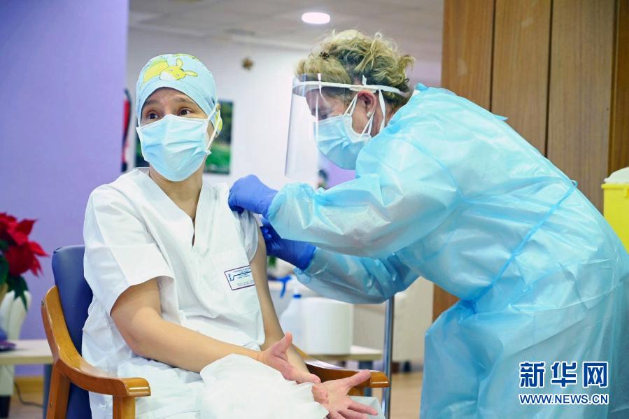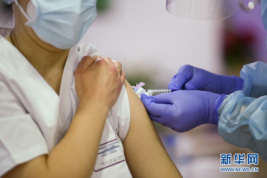12月27日,在羅馬尼亞首都布加勒斯特一家傳染病醫(yī)院,一名醫(yī)務(wù)人員在接受新冠疫苗接種。新華社發(fā)(彼得雷斯庫攝)