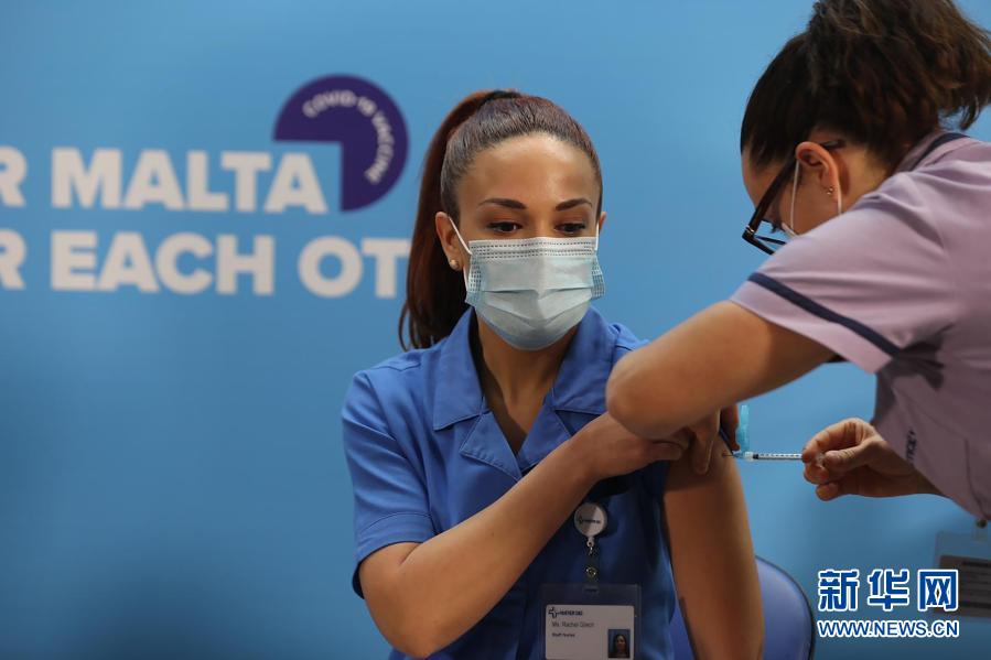 12月27日,在馬耳他瓦萊塔,國立圣母醫(yī)院護士蕾切爾·格雷奇接種新冠疫苗。新華社發(fā)(喬納森·博格 攝)