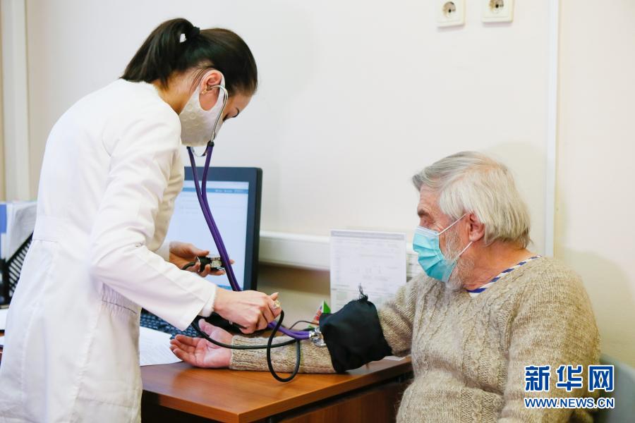 12月30日,在俄羅斯首都莫斯科,醫(yī)護(hù)人員在進(jìn)行疫苗接種前為一名老人測量體溫。新華社發(fā)(亞歷山大攝)