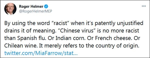 大量網(wǎng)友在他的這條推特下,挖出赫爾默曾經(jīng)發(fā)表的言論。例如早在3月17日,赫爾默就在一條推特中宣稱(chēng):“在明顯不合理的情況下,使用‘種族主義’這個(gè)詞會(huì)讓它失去意義。‘中國(guó)病毒’和‘西班牙流感’一樣不是種族主義。就像印度玉米,或法國(guó)奶酪,或者智利葡萄酒。它僅僅是指原產(chǎn)國(guó)?!?/p>