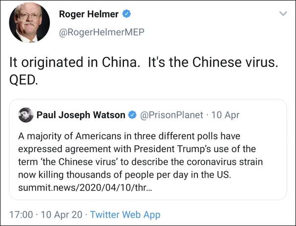 赫爾默28日推文稱(chēng)不要將病毒變種稱(chēng)為“起源自英國(guó)”,但4月發(fā)布的下圖聲稱(chēng)病毒“起源自中國(guó),就是中國(guó)病毒”。