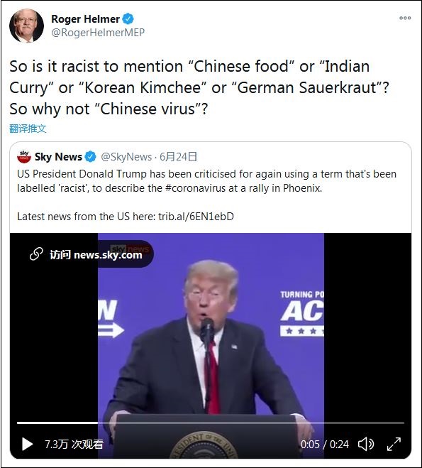 6月24日,赫爾默轉(zhuǎn)發(fā)了特朗普集會(huì)上喊“功夫病毒”的視頻,并評(píng)論稱(chēng):“說(shuō)中國(guó)菜、印度菜、韓國(guó)泡菜或德國(guó)酸菜是種族歧視嗎?那么,為什么‘中國(guó)病毒’(是呢)?”