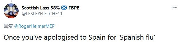 另一名網(wǎng)友接茬說(shuō):“只要你為‘西班牙流感’向西班牙道歉。”赫爾默也曾借用“西班牙流感”,為“中國(guó)流感”的說(shuō)法狡辯。
