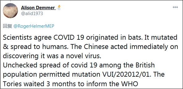 他在12月28日的一條推特中請(qǐng)求外界不要再將變異新冠病毒稱(chēng)為“起源于英國(guó)”,而只是“在英國(guó)發(fā)現(xiàn)”。但這條推特徹底“翻車(chē)”,大量網(wǎng)民在評(píng)論中挖出赫爾默曾將新冠病毒污蔑為“中國(guó)病毒”的評(píng)論,指責(zé)他演繹“非常標(biāo)準(zhǔn)的雙重標(biāo)準(zhǔn)”。