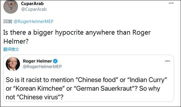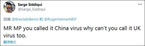 不少網(wǎng)友指出了赫爾默的雙標(biāo)?!白h員先生,你管這(新冠病毒)叫‘中國(guó)病毒’,為什么不也把它叫做英國(guó)病毒?”