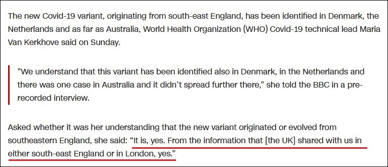 12月20日,世衛(wèi)組織緊急項(xiàng)目技術(shù)主管瑪麗亞·范·克爾科夫(Maria Van Kerkhove)曾在采訪(fǎng)中被問(wèn)及變異病毒是否起源或在英國(guó)東南部進(jìn)化的問(wèn)題,她回答說(shuō):“是的。從英國(guó)和我們分享的信息來(lái)看,要么是在英國(guó)東南部,要么是在倫敦。是的。”