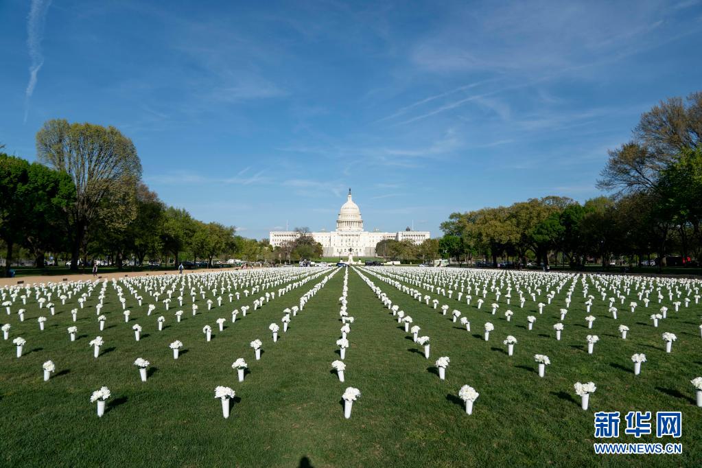 這是4月13日拍攝的美國(guó)華盛頓國(guó)家廣場(chǎng)草坪上擺放的白色絹花。