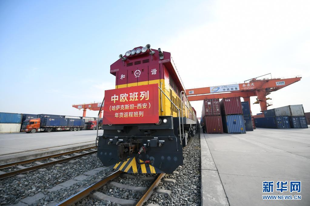 2月3日,滿載年貨的中歐班列抵達(dá)中國(guó)鐵路西安局集團(tuán)有限公司新筑車站。新華社記者 李一博 攝