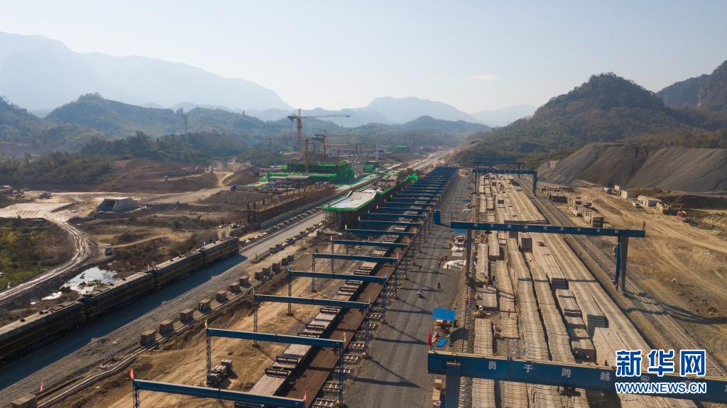 這是2020年12月29日在老撾瑯勃拉邦拍攝的中老鐵路瑯勃拉邦車站鋪軌現(xiàn)場(航拍照片)。新華社發(fā)(老中鐵路有限公司供圖)