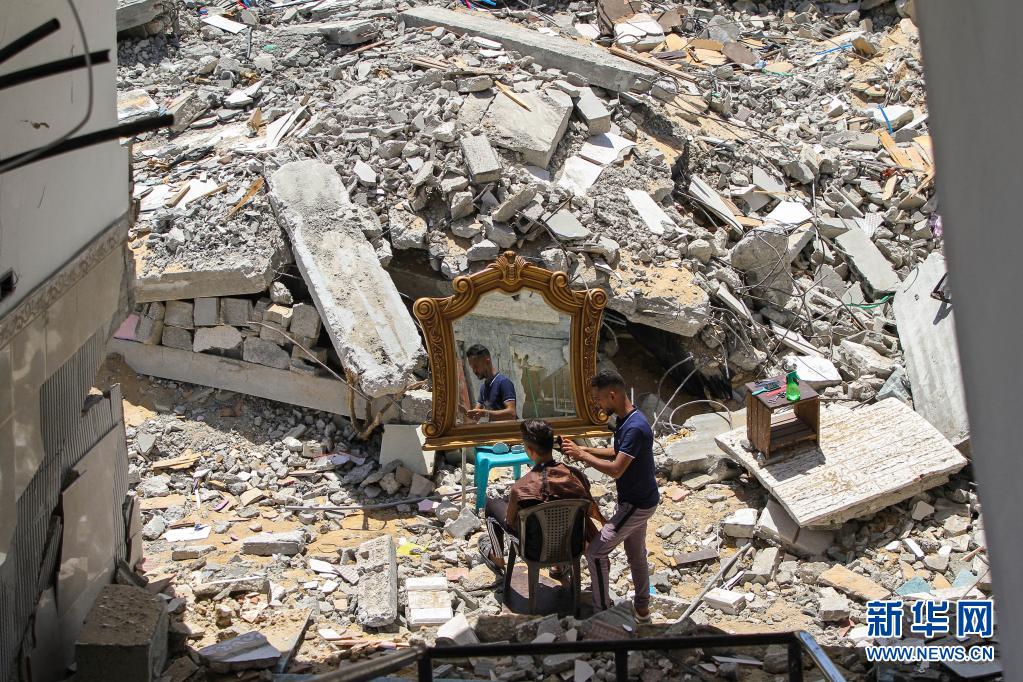5月26日,在加沙地帶北部的城鎮(zhèn)貝特拉希亞,23歲的巴勒斯坦理發(fā)師阿卜杜拉·扎瓦拉在他被以色列炸毀的房屋前為顧客免費服務?!⌒氯A社發(fā)(里澤克·阿卜杜勒·賈瓦德攝)