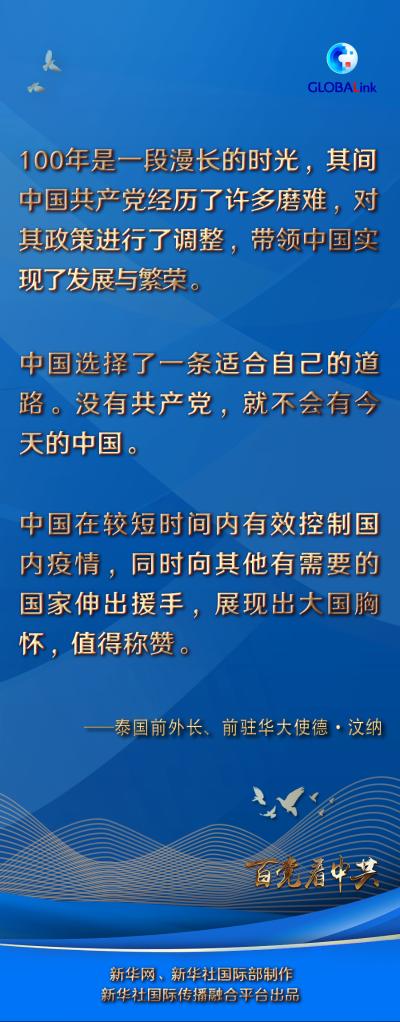 新華社曼谷5月29日電 “100年是一段漫長的時光,其間中國共產(chǎn)黨經(jīng)歷了許多磨難,對其政策進行了調(diào)整,帶領(lǐng)中國實現(xiàn)了發(fā)展與繁榮?!碧﹪巴忾L、前駐華大使德·汶納日前在曼谷接受新華社專訪時說。
