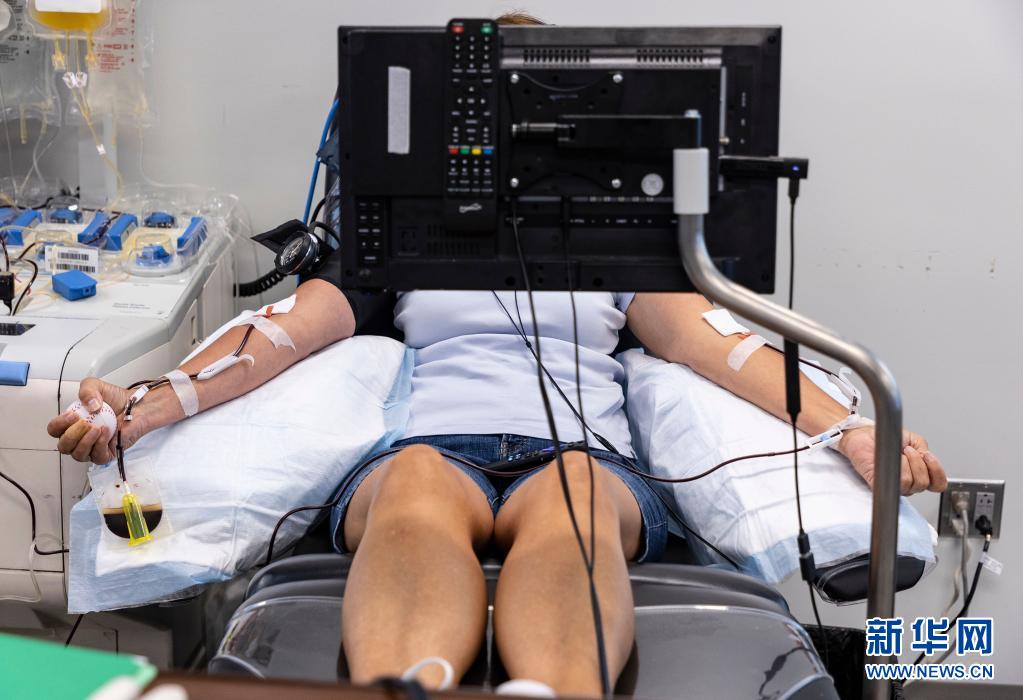 6月14日,在美國芝加哥,一名獻(xiàn)血志愿者在大芝加哥地區(qū)紅十字會一獻(xiàn)血站內(nèi)獻(xiàn)血。新華社發(fā)(喬爾·萊納攝)