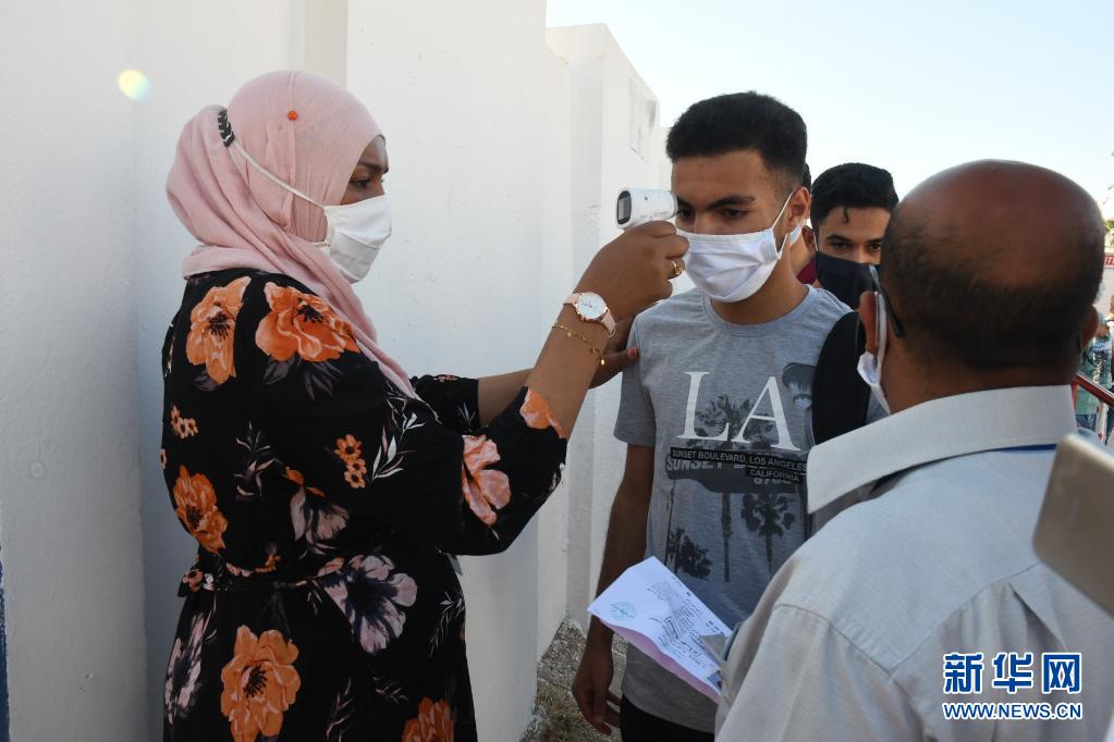 6月16日,工作人員在突尼斯首都突尼斯市一個(gè)考場(chǎng)外給準(zhǔn)備參加高等學(xué)校入學(xué)考試的學(xué)生測(cè)量體溫。